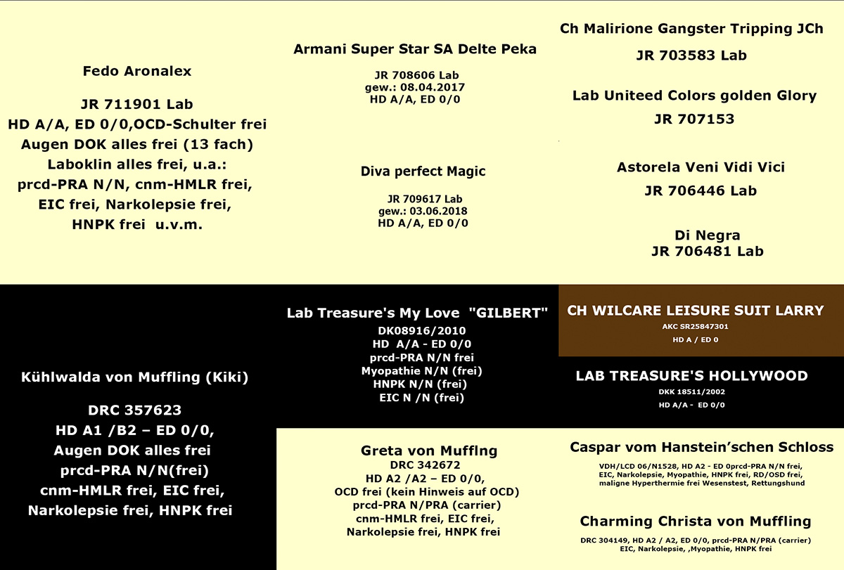 Degenerative Myelopathie N/N, Exercise Induced Collapse (EIC) N/N, Hereditäre Nasale Parakeratose (HNPK) N/N, Erbliche Myopathie (CNM) N/N, Progressive Retinaatrophie N/N, Retinale Dysplasie (OSD) N/N, Narkolepsie N/N, Stargardt-Syndrom (STGD, Retinale Degeneration) N/N, Kupferspeichererkrankung (CT) – Risikofaktor -PCR – N/N